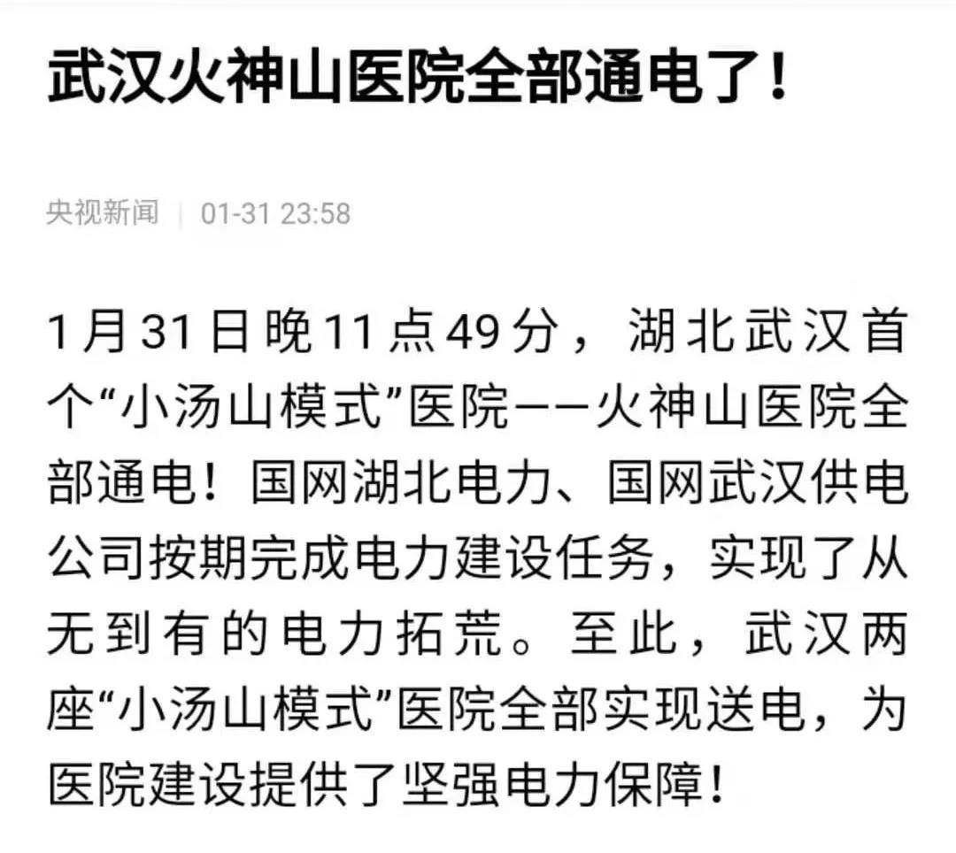 世人拾柴,点亮火神山。1月31日晚11点49分,湖北武汉首个“小汤山模式”病院火神山病院全数通电。